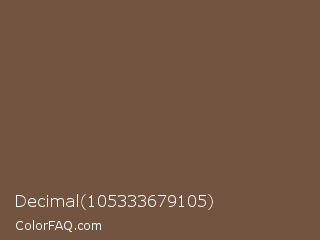 Decimal 105333679105 Color is a normal orange color and the nearest color is Tobacco Brown #715d47. Hex code #735441 and RGB value is rgb(115,84,65). In RGB color space, this color is composed of 45% red, 33% green, 25% blue, In CMYK color space, this color is composed of 0% cyan, 27% magenta, 43% yellow , 55% black , In HSL color space, this color has a hue angle of 23° , 28% saturation and 35% lightness.