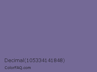 Decimal 105334141848 Color is a normal indigo color and the nearest color is Kimberly #736c9f. Hex code #746996 and RGB value is rgb(116,105,150). In RGB color space, this color is composed of 45% red, 41% green, 59% blue, In CMYK color space, this color is composed of 23% cyan, 30% magenta, 0% yellow , 41% black , In HSL color space, this color has a hue angle of 255° , 18% saturation and 50% lightness.