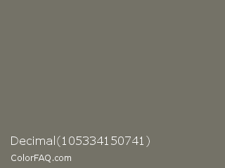 Decimal 105334150741 Color is a normal yellow color and the nearest color is Pablo #776f61. Hex code #747267 and RGB value is rgb(116,114,103). In RGB color space, this color is composed of 45% red, 45% green, 40% blue, In CMYK color space, this color is composed of 0% cyan, 2% magenta, 11% yellow , 55% black , In HSL color space, this color has a hue angle of 51° , 6% saturation and 43% lightness.