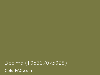 Decimal 105337075028 Color is a normal yellow color and the nearest color is Pesto #7c7631. Hex code #787942 and RGB value is rgb(120,121,66). In RGB color space, this color is composed of 47% red, 47% green, 26% blue, In CMYK color space, this color is composed of 1% cyan, 0% magenta, 45% yellow , 53% black , In HSL color space, this color has a hue angle of 61° , 29% saturation and 37% lightness.