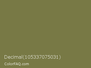 Decimal 105337075031 Color is a normal yellow color and the nearest color is Go Ben #726d4e. Hex code #787945 and RGB value is rgb(120,121,69). In RGB color space, this color is composed of 47% red, 47% green, 27% blue, In CMYK color space, this color is composed of 1% cyan, 0% magenta, 43% yellow , 53% black , In HSL color space, this color has a hue angle of 61° , 27% saturation and 37% lightness.