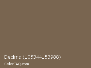 Decimal 105344153988 Color is a normal orange color and the nearest color is Roman Coffee #795d4c. Hex code #796550 and RGB value is rgb(121,101,80). In RGB color space, this color is composed of 47% red, 40% green, 31% blue, In CMYK color space, this color is composed of 0% cyan, 17% magenta, 34% yellow , 53% black , In HSL color space, this color has a hue angle of 31° , 20% saturation and 39% lightness.