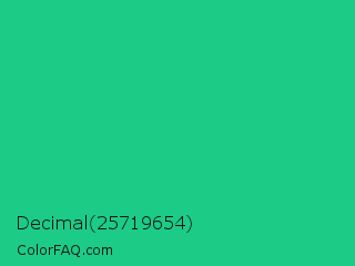 Decimal 25719654 Color is a normal green color and the nearest color is Mountain Meadow Crayola #1ab385. Hex code #1ccc86 and RGB value is rgb(28,204,134). In RGB color space, this color is composed of 11% red, 80% green, 53% blue, In CMYK color space, this color is composed of 86% cyan, 0% magenta, 34% yellow , 20% black , In HSL color space, this color has a hue angle of 156° , 76% saturation and 45% lightness.