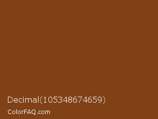 Decimal 105348674659 Color is a dark orange color and the nearest color is Russet #80461b. Hex code #804117 and RGB value is rgb(128,65,23). In RGB color space, this color is composed of 50% red, 25% green, 9% blue, In CMYK color space, this color is composed of 0% cyan, 49% magenta, 82% yellow , 50% black , In HSL color space, this color has a hue angle of 24° , 70% saturation and 30% lightness.