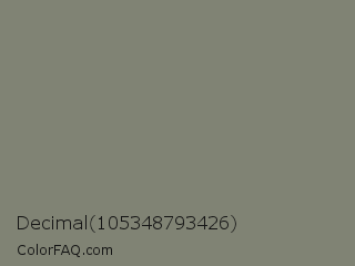 Decimal 105348793426 Color is a normal lime color and the nearest color is Bandicoot #858470. Hex code #808374 and RGB value is rgb(128,131,116). In RGB color space, this color is composed of 50% red, 51% green, 45% blue, In CMYK color space, this color is composed of 2% cyan, 0% magenta, 11% yellow , 49% black , In HSL color space, this color has a hue angle of 72° , 6% saturation and 48% lightness.