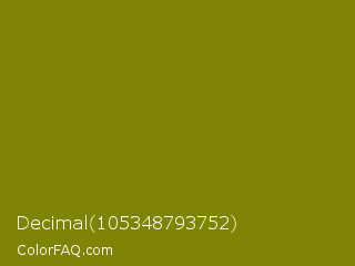 Decimal 105348793752 Color is a dark yellow color and the nearest color is Olive #808000. Hex code #808406 and RGB value is rgb(128,132,6). In RGB color space, this color is composed of 50% red, 52% green, 2% blue, In CMYK color space, this color is composed of 3% cyan, 0% magenta, 95% yellow , 48% black , In HSL color space, this color has a hue angle of 62° , 91% saturation and 27% lightness.