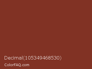 Decimal 105349468530 Color is a normal red color and the nearest color is Red Robin #80341f. Hex code #813224 and RGB value is rgb(129,50,36). In RGB color space, this color is composed of 51% red, 20% green, 14% blue, In CMYK color space, this color is composed of 0% cyan, 61% magenta, 72% yellow , 49% black , In HSL color space, this color has a hue angle of 9° , 56% saturation and 32% lightness.