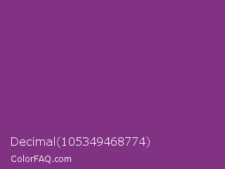 Decimal 105349468774 Color is a normal magenta color and the nearest color is Razzmic Berry Crayola #843179. Hex code #813282 and RGB value is rgb(129,50,130). In RGB color space, this color is composed of 51% red, 20% green, 51% blue, In CMYK color space, this color is composed of 1% cyan, 62% magenta, 0% yellow , 49% black , In HSL color space, this color has a hue angle of 299° , 44% saturation and 35% lightness.