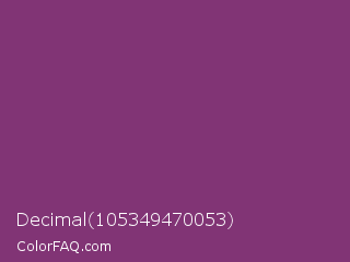Decimal 105349470053 Color is a normal magenta color and the nearest color is Razzmic Berry Crayola #843179. Hex code #813475 and RGB value is rgb(129,52,117). In RGB color space, this color is composed of 51% red, 20% green, 46% blue, In CMYK color space, this color is composed of 0% cyan, 60% magenta, 9% yellow , 49% black , In HSL color space, this color has a hue angle of 309° , 43% saturation and 35% lightness.