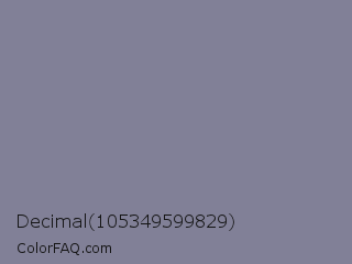 Decimal 105349599829 Color is a normal indigo color and the nearest color is Waterloo #7b7c94. Hex code #818097 and RGB value is rgb(129,128,151). In RGB color space, this color is composed of 51% red, 50% green, 59% blue, In CMYK color space, this color is composed of 15% cyan, 15% magenta, 0% yellow , 41% black , In HSL color space, this color has a hue angle of 243° , 10% saturation and 55% lightness.