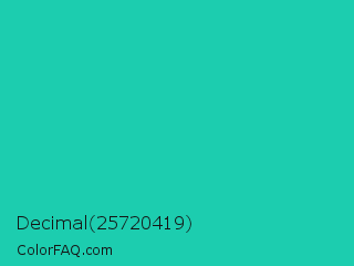 Decimal 25720419 Color is a normal cyan color and the nearest color is Java #1fc2c2. Hex code #1ccdaf and RGB value is rgb(28,205,175). In RGB color space, this color is composed of 11% red, 80% green, 69% blue, In CMYK color space, this color is composed of 86% cyan, 0% magenta, 15% yellow , 20% black , In HSL color space, this color has a hue angle of 170° , 76% saturation and 46% lightness.