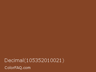 Decimal 105352010021 Color is a normal orange color and the nearest color is Nutmeg #81422c. Hex code #854425 and RGB value is rgb(133,68,37). In RGB color space, this color is composed of 52% red, 27% green, 15% blue, In CMYK color space, this color is composed of 0% cyan, 49% magenta, 72% yellow , 48% black , In HSL color space, this color has a hue angle of 19° , 56% saturation and 33% lightness.