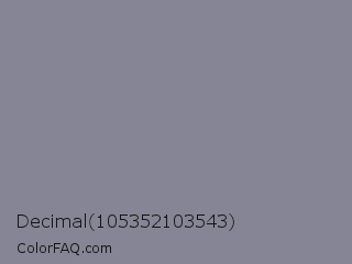 Decimal 105352103543 Color is a normal blue color and the nearest color is Roman Silver #838996. Hex code #858595 and RGB value is rgb(133,133,149). In RGB color space, this color is composed of 52% red, 52% green, 58% blue, In CMYK color space, this color is composed of 11% cyan, 11% magenta, 0% yellow , 42% black , In HSL color space, this color has a hue angle of 240° , 7% saturation and 55% lightness.