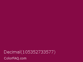 Decimal 105352733577 Color is a dark rose color and the nearest color is Rose Bud Cherry #800b47. Hex code #860945 and RGB value is rgb(134,9,69). In RGB color space, this color is composed of 53% red, 4% green, 27% blue, In CMYK color space, this color is composed of 0% cyan, 93% magenta, 49% yellow , 47% black , In HSL color space, this color has a hue angle of 331° , 87% saturation and 28% lightness.