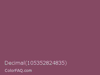 Decimal 105352824835 Color is a normal rose color and the nearest color is Cannon Pink #894367. Hex code #864963 and RGB value is rgb(134,73,99). In RGB color space, this color is composed of 53% red, 29% green, 39% blue, In CMYK color space, this color is composed of 0% cyan, 46% magenta, 26% yellow , 47% black , In HSL color space, this color has a hue angle of 334° , 29% saturation and 41% lightness.