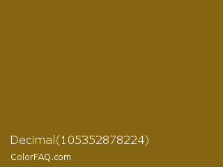Decimal 105352878224 Color is a dark orange color and the nearest color is Corn Harvest #8b6b0b. Hex code #866512 and RGB value is rgb(134,101,18). In RGB color space, this color is composed of 53% red, 40% green, 7% blue, In CMYK color space, this color is composed of 0% cyan, 25% magenta, 87% yellow , 47% black , In HSL color space, this color has a hue angle of 43° , 76% saturation and 30% lightness.