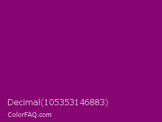 Decimal 105353146883 Color is a dark magenta color and the nearest color is Patriarch #800080. Hex code #870673 and RGB value is rgb(135,6,115). In RGB color space, this color is composed of 53% red, 2% green, 45% blue, In CMYK color space, this color is composed of 0% cyan, 96% magenta, 15% yellow , 47% black , In HSL color space, this color has a hue angle of 309° , 91% saturation and 28% lightness.
