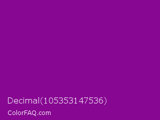 Decimal 105353147536 Color is a dark magenta color and the nearest color is Dark Magenta #8b008b. Hex code #870792 and RGB value is rgb(135,7,146). In RGB color space, this color is composed of 53% red, 3% green, 57% blue, In CMYK color space, this color is composed of 8% cyan, 95% magenta, 0% yellow , 43% black , In HSL color space, this color has a hue angle of 295° , 91% saturation and 30% lightness.