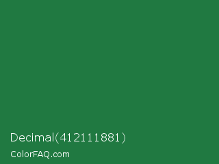 Decimal 412111881 Color is a dark green color and the nearest color is Dark Spring Green #177245. Hex code #207941 and RGB value is rgb(32,121,65). In RGB color space, this color is composed of 13% red, 47% green, 25% blue, In CMYK color space, this color is composed of 74% cyan, 0% magenta, 46% yellow , 53% black , In HSL color space, this color has a hue angle of 142° , 58% saturation and 30% lightness.
