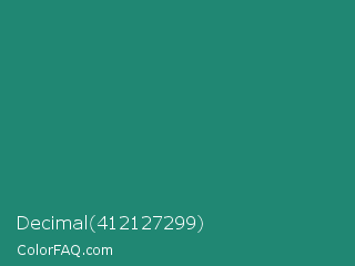 Decimal 412127299 Color is a normal cyan color and the nearest color is Elm #1c7c7d. Hex code #208773 and RGB value is rgb(32,135,115). In RGB color space, this color is composed of 13% red, 53% green, 45% blue, In CMYK color space, this color is composed of 76% cyan, 0% magenta, 15% yellow , 47% black , In HSL color space, this color has a hue angle of 168° , 62% saturation and 33% lightness.