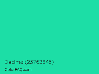 Decimal 25763846 Color is a normal green color and the nearest color is Shamrock #33cc99. Hex code #1cdea6 and RGB value is rgb(28,222,166). In RGB color space, this color is composed of 11% red, 87% green, 65% blue, In CMYK color space, this color is composed of 87% cyan, 0% magenta, 25% yellow , 13% black , In HSL color space, this color has a hue angle of 163° , 78% saturation and 49% lightness.