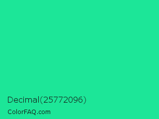 Decimal 25772096 Color is a normal green color and the nearest color is Medium Spring Green #00fa9a. Hex code #1ce698 and RGB value is rgb(28,230,152). In RGB color space, this color is composed of 11% red, 90% green, 60% blue, In CMYK color space, this color is composed of 88% cyan, 0% magenta, 34% yellow , 10% black , In HSL color space, this color has a hue angle of 157° , 80% saturation and 51% lightness.