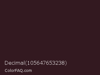 Decimal 105647653238 Color is a very dark rose color and the nearest color is Cocoa Brown #301f1e. Hex code #331920 and RGB value is rgb(51,25,32). In RGB color space, this color is composed of 20% red, 10% green, 13% blue, In CMYK color space, this color is composed of 0% cyan, 51% magenta, 37% yellow , 80% black , In HSL color space, this color has a hue angle of 344° , 34% saturation and 15% lightness.