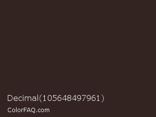 Decimal 105648497961 Color is a very dark red color and the nearest color is Cocoa Brown #301f1e. Hex code #342421 and RGB value is rgb(52,36,33). In RGB color space, this color is composed of 20% red, 14% green, 13% blue, In CMYK color space, this color is composed of 0% cyan, 31% magenta, 37% yellow , 80% black , In HSL color space, this color has a hue angle of 9° , 22% saturation and 17% lightness.