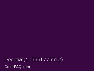 Decimal 105651775512 Color is a very dark purple color and the nearest color is Valentino #350e42. Hex code #390742 and RGB value is rgb(57,7,66). In RGB color space, this color is composed of 22% red, 3% green, 26% blue, In CMYK color space, this color is composed of 14% cyan, 89% magenta, 0% yellow , 74% black , In HSL color space, this color has a hue angle of 291° , 81% saturation and 14% lightness.