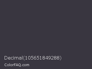Decimal 105651849288 Color is a dark indigo color and the nearest color is Tuna #353542. Hex code #393640 and RGB value is rgb(57,54,64). In RGB color space, this color is composed of 22% red, 21% green, 25% blue, In CMYK color space, this color is composed of 11% cyan, 16% magenta, 0% yellow , 75% black , In HSL color space, this color has a hue angle of 258° , 8% saturation and 23% lightness.
