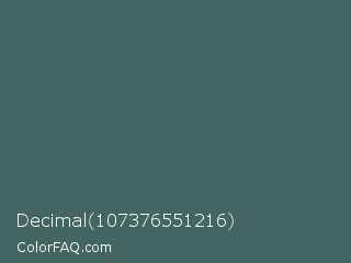 Decimal 107376551216 Color is a normal cyan color and the nearest color is Deep Space Sparkle #4a646c. Hex code #436662 and RGB value is rgb(67,102,98). In RGB color space, this color is composed of 26% red, 40% green, 38% blue, In CMYK color space, this color is composed of 34% cyan, 0% magenta, 4% yellow , 60% black , In HSL color space, this color has a hue angle of 173° , 21% saturation and 33% lightness.