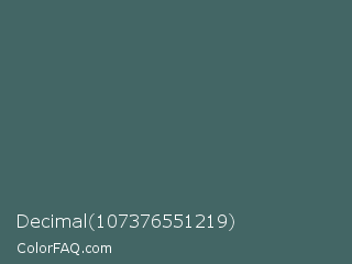 Decimal 107376551219 Color is a normal cyan color and the nearest color is Deep Space Sparkle #4a646c. Hex code #436665 and RGB value is rgb(67,102,101). In RGB color space, this color is composed of 26% red, 40% green, 40% blue, In CMYK color space, this color is composed of 34% cyan, 0% magenta, 1% yellow , 60% black , In HSL color space, this color has a hue angle of 178° , 21% saturation and 33% lightness.