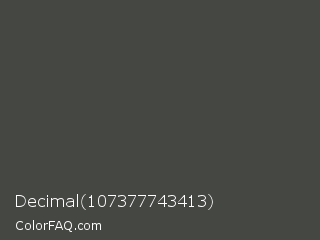 Decimal 107377743413 Color is a dark green color and the nearest color is Tundora #4a4244. Hex code #454743 and RGB value is rgb(69,71,67). In RGB color space, this color is composed of 27% red, 28% green, 26% blue, In CMYK color space, this color is composed of 3% cyan, 0% magenta, 6% yellow , 72% black , In HSL color space, this color has a hue angle of 90° , 3% saturation and 27% lightness.