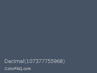Decimal 107377755968 Color is a normal blue color and the nearest color is Fiord #405169. Hex code #455364 and RGB value is rgb(69,83,100). In RGB color space, this color is composed of 27% red, 33% green, 39% blue, In CMYK color space, this color is composed of 31% cyan, 17% magenta, 0% yellow , 61% black , In HSL color space, this color has a hue angle of 213° , 18% saturation and 33% lightness.
