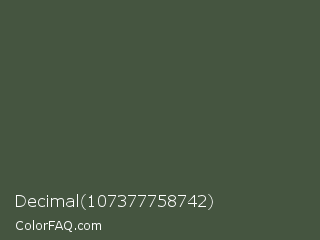 Decimal 107377758742 Color is a dark green color and the nearest color is Gray Asparagus #465945. Hex code #455540 and RGB value is rgb(69,85,64). In RGB color space, this color is composed of 27% red, 33% green, 25% blue, In CMYK color space, this color is composed of 19% cyan, 0% magenta, 25% yellow , 67% black , In HSL color space, this color has a hue angle of 106° , 14% saturation and 29% lightness.