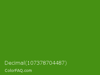 Decimal 107378704487 Color is a normal green color and the nearest color is Vida Loca #549019. Hex code #469113 and RGB value is rgb(70,145,19). In RGB color space, this color is composed of 27% red, 57% green, 7% blue, In CMYK color space, this color is composed of 52% cyan, 0% magenta, 87% yellow , 43% black , In HSL color space, this color has a hue angle of 96° , 77% saturation and 32% lightness.