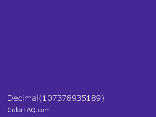 Decimal 107378935189 Color is a normal indigo color and the nearest color is Daisy Bush #4f2398. Hex code #472793 and RGB value is rgb(71,39,147). In RGB color space, this color is composed of 28% red, 15% green, 58% blue, In CMYK color space, this color is composed of 52% cyan, 73% magenta, 0% yellow , 42% black , In HSL color space, this color has a hue angle of 258° , 58% saturation and 36% lightness.