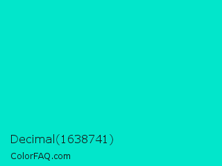 Decimal 1638741 Color is a normal cyan color and the nearest color is Bright Turquoise #08e8de. Hex code #02e6cb and RGB value is rgb(2,230,203). In RGB color space, this color is composed of 1% red, 90% green, 80% blue, In CMYK color space, this color is composed of 99% cyan, 0% magenta, 12% yellow , 10% black , In HSL color space, this color has a hue angle of 173° , 98% saturation and 45% lightness.