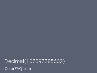 Decimal 107397785602 Color is a normal blue color and the nearest color is Comet #5c5d75. Hex code #596072 and RGB value is rgb(89,96,114). In RGB color space, this color is composed of 35% red, 38% green, 45% blue, In CMYK color space, this color is composed of 22% cyan, 16% magenta, 0% yellow , 55% black , In HSL color space, this color has a hue angle of 223° , 12% saturation and 40% lightness.
