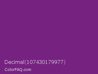 Decimal 107430179977 Color is a normal magenta color and the nearest color is Seance #731e8f. Hex code #762281 and RGB value is rgb(118,34,129). In RGB color space, this color is composed of 46% red, 13% green, 51% blue, In CMYK color space, this color is composed of 9% cyan, 74% magenta, 0% yellow , 49% black , In HSL color space, this color has a hue angle of 293° , 58% saturation and 32% lightness.