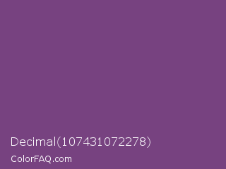 Decimal 107431072278 Color is a normal purple color and the nearest color is Maximum Purple #733380. Hex code #774280 and RGB value is rgb(119,66,128). In RGB color space, this color is composed of 47% red, 26% green, 50% blue, In CMYK color space, this color is composed of 7% cyan, 48% magenta, 0% yellow , 50% black , In HSL color space, this color has a hue angle of 291° , 32% saturation and 38% lightness.