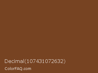 Decimal 107431072632 Color is a dark orange color and the nearest color is Walnut #773f1a. Hex code #774322 and RGB value is rgb(119,67,34). In RGB color space, this color is composed of 47% red, 26% green, 13% blue, In CMYK color space, this color is composed of 0% cyan, 44% magenta, 71% yellow , 53% black , In HSL color space, this color has a hue angle of 23° , 56% saturation and 30% lightness.