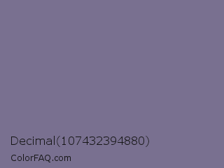 Decimal 107432394880 Color is a normal indigo color and the nearest color is Rhythm #777696. Hex code #797090 and RGB value is rgb(121,112,144). In RGB color space, this color is composed of 47% red, 44% green, 56% blue, In CMYK color space, this color is composed of 16% cyan, 22% magenta, 0% yellow , 44% black , In HSL color space, this color has a hue angle of 257° , 13% saturation and 50% lightness.
