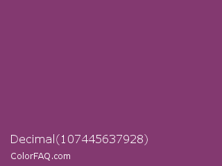 Decimal 107445637928 Color is a normal magenta color and the nearest color is Razzmic Berry Crayola #843179. Hex code #833970 and RGB value is rgb(131,57,112). In RGB color space, this color is composed of 51% red, 22% green, 44% blue, In CMYK color space, this color is composed of 0% cyan, 56% magenta, 15% yellow , 49% black , In HSL color space, this color has a hue angle of 315° , 39% saturation and 37% lightness.