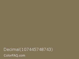 Decimal 107445748743 Color is a normal orange color and the nearest color is Shadow Crayola #837050. Hex code #837457 and RGB value is rgb(131,116,87). In RGB color space, this color is composed of 51% red, 45% green, 34% blue, In CMYK color space, this color is composed of 0% cyan, 11% magenta, 34% yellow , 49% black , In HSL color space, this color has a hue angle of 40° , 20% saturation and 43% lightness.