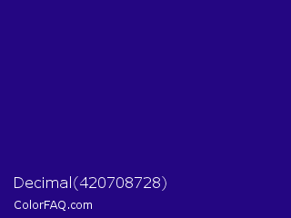 Decimal 420708728 Color is a dark indigo color and the nearest color is Deep Blue #220878. Hex code #240682 and RGB value is rgb(36,6,130). In RGB color space, this color is composed of 14% red, 2% green, 51% blue, In CMYK color space, this color is composed of 72% cyan, 95% magenta, 0% yellow , 49% black , In HSL color space, this color has a hue angle of 255° , 91% saturation and 27% lightness.