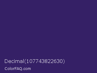 Decimal 107743822630 Color is a dark indigo color and the nearest color is Jacarta #3a2a6a. Hex code #352066 and RGB value is rgb(53,32,102). In RGB color space, this color is composed of 21% red, 13% green, 40% blue, In CMYK color space, this color is composed of 48% cyan, 69% magenta, 0% yellow , 60% black , In HSL color space, this color has a hue angle of 258° , 52% saturation and 26% lightness.