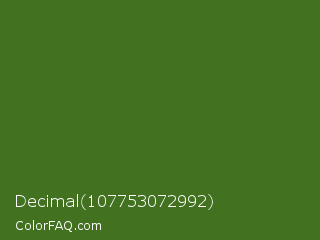 Decimal 107753072992 Color is a dark green color and the nearest color is Green Leaf #436a0d. Hex code #427120 and RGB value is rgb(66,113,32). In RGB color space, this color is composed of 26% red, 44% green, 13% blue, In CMYK color space, this color is composed of 42% cyan, 0% magenta, 72% yellow , 56% black , In HSL color space, this color has a hue angle of 95° , 56% saturation and 28% lightness.