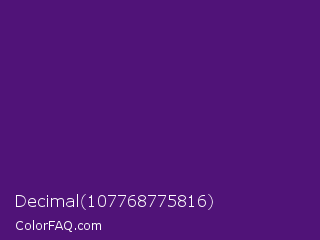 Decimal 107768775816 Color is a dark purple color and the nearest color is Honey Flower #4f1c70. Hex code #501378 and RGB value is rgb(80,19,120). In RGB color space, this color is composed of 31% red, 7% green, 47% blue, In CMYK color space, this color is composed of 33% cyan, 84% magenta, 0% yellow , 53% black , In HSL color space, this color has a hue angle of 276° , 73% saturation and 27% lightness.