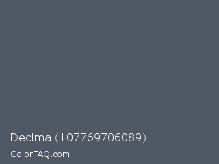 Decimal 107769706089 Color is a normal blue color and the nearest color is Scarpa Flow #585562. Hex code #515865 and RGB value is rgb(81,88,101). In RGB color space, this color is composed of 32% red, 35% green, 40% blue, In CMYK color space, this color is composed of 20% cyan, 13% magenta, 0% yellow , 60% black , In HSL color space, this color has a hue angle of 219° , 11% saturation and 36% lightness.